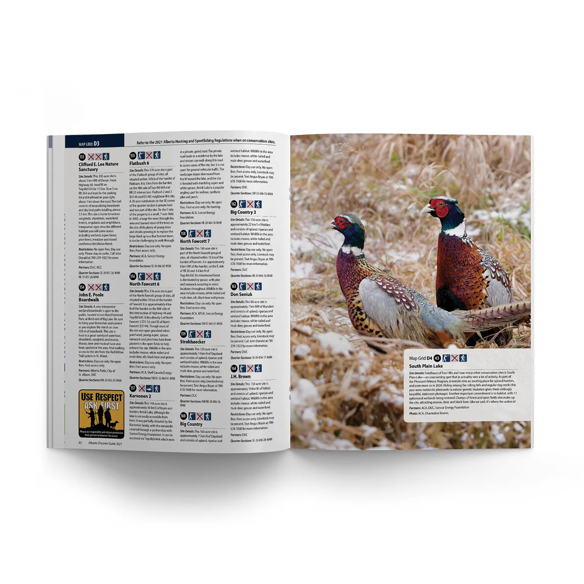 Design of the Alberta Discover Guide. A annual publication that provides outdoor enthusiasts with information about conservation sites that can be accessed for hunting, fishing, hiking, and more. The publication itself contains detailed maps and editorial content in addition to site specific directions, restrictions, and contact information.